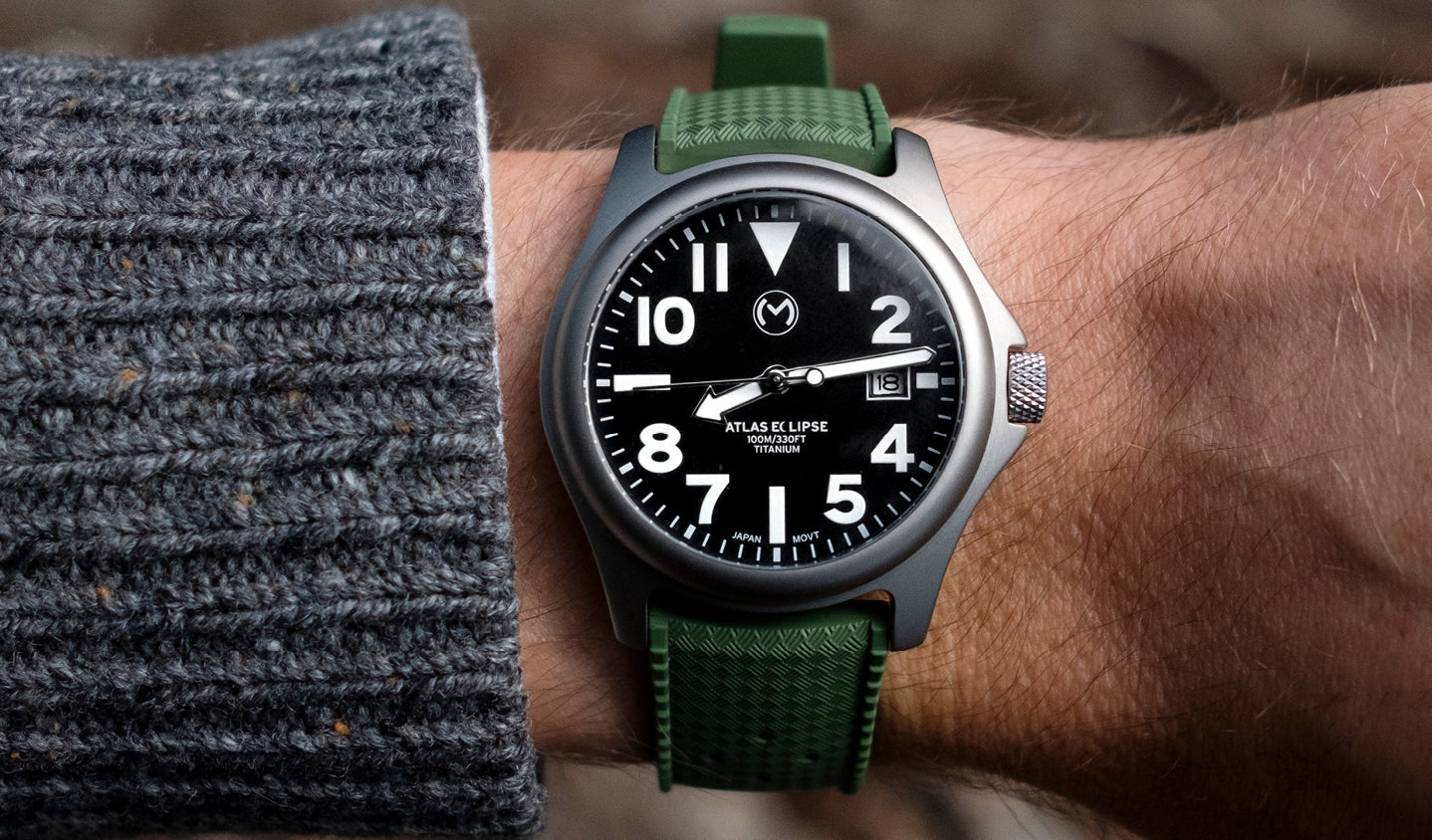 The Atlas Eclipse Solar is your go-anywhere, do-anything field watch. A longtime bestseller, the Atlas has been reimagined with a solar-powered Japanese Epson VS42 movement, eliminating the need for regular battery changes and significantly reducing environmental impact. No downtime, no waste, just reliable timekeeping, powered by light.