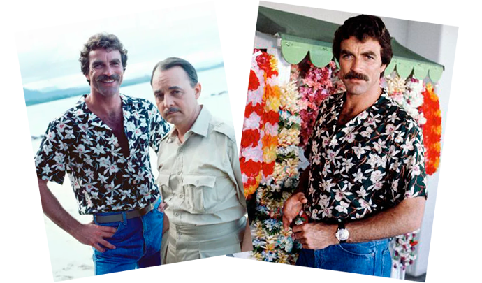 Tom Selleck wore the previous version of this “Star Orchid” print on the original Magnum PI. Please note: our shirts are not endorsed by Tom Selleck. Images are used for educational purposes.