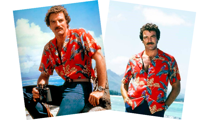 This is the shirt that was featured in the original Magnum PI series and is in the Smithsonian Museum of American History. It is sometimes referred to as the "Jungle Bird" shirt. Please note: our shirts are not endorsed by Tom Selleck. Images are used for educational purposes.